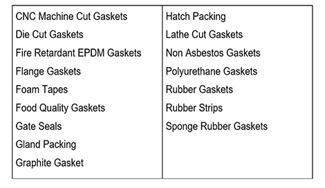 Neoprene, Natural Rubber, SBR, Nitrile, EPDM, Butyl, Silicone Latex; FKM Viton, F DA Sheeting, Polythene, Rubber Bonded Cork, Expanded Polythene, Sponge Rubbers, Expanded Neoprene, Expanded EPDM, Fire Retardant Neoprene,, Reticulated Foam, PTFE, Industrial Felt, Expanded Graphite, NovusTM, Non-Asbestos